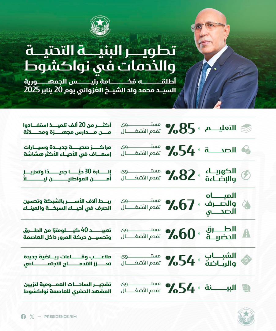 ضمن الجهود الحكومية لتطوير البنية التحتية وتحسين جودة الخدمات في العاصمة نواكشوط، يواصل البرنامج الاستعجالي لتنمية مدينة نواكشوط تنفيذ مكونة الكهرباء والإنارة العمومية، والتي سجلت نسبة إنجاز بلغت 82.04%، واستفادت منها 50% من الأحياء المستهدفة حتى الآن.