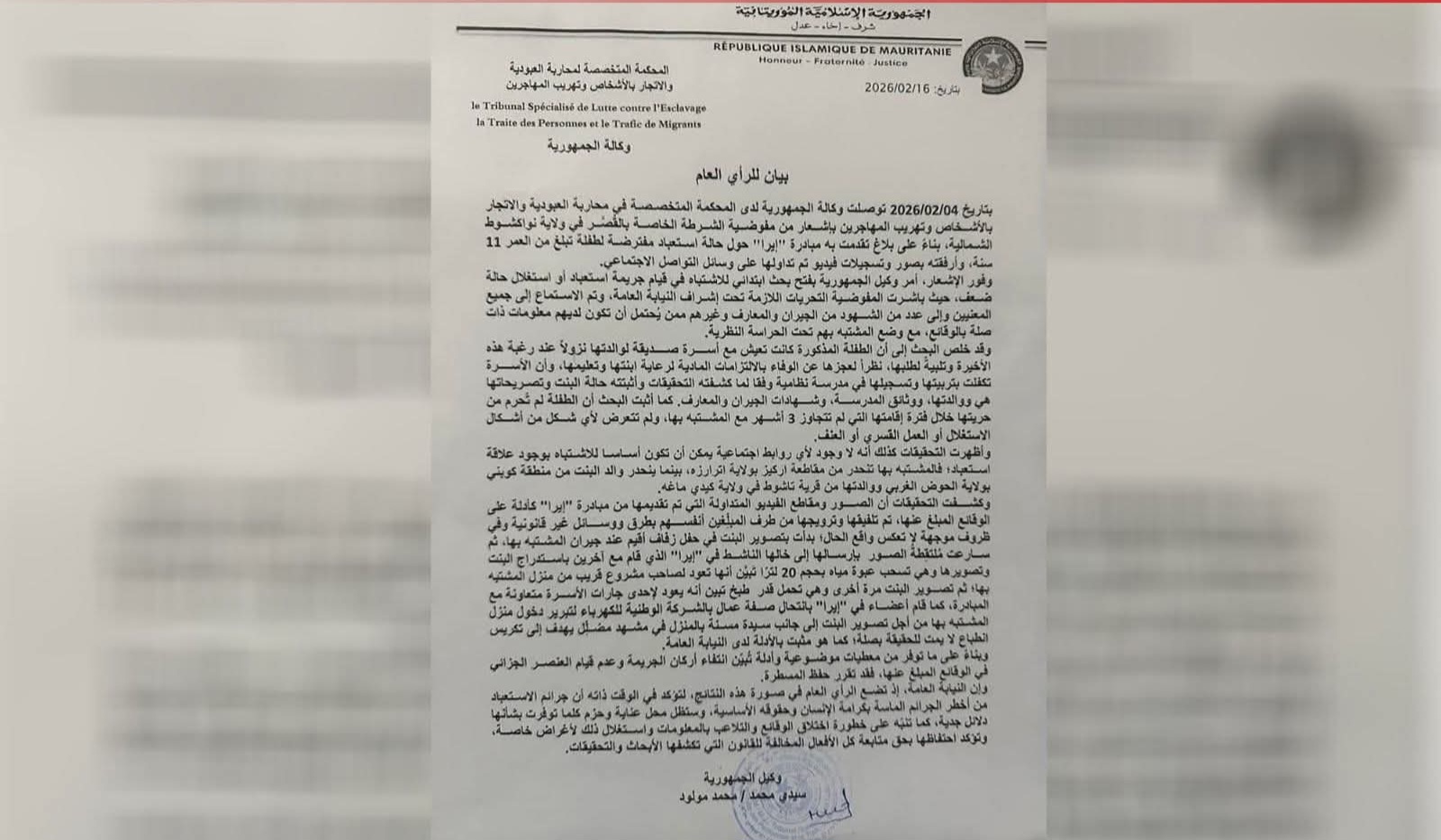 وأظهرت التحقيقات -بحسب بيان صادر عن النيابة بنواكشوط الشمالية- أن الصور ومقاطع الفيديو المتداولة التي تم تقديمها من مبادرة "إيرا" كأدلة على الوقائع المبلغ عنها، تم تلفيقها وترويجها من طرف المبلغين أنفسهم بطرق ووسائل غير قانونية.